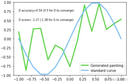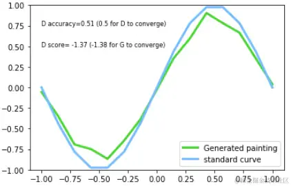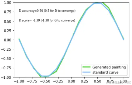 完美!经过 10000 次迭代训练之后,生成的曲线已经与标准曲线非常接近了。D 的 score 也如预期接近 0.5。