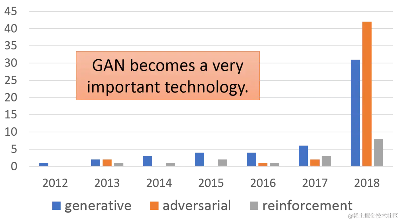 数据表明,2018 年,包含关键词 “generative” 和 “adversarial” 的论文数量发生井喷式增长。不难预见, 未来几年关于 GAN 的论文会更多。
