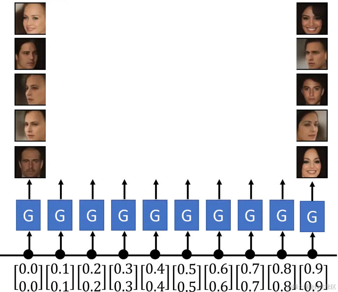 这里,重点要讲解一下输入 vector。输入向量是用来做什么的呢?其实,输入 vector 中的每一维度都可以代表输出图片的某个特征。比如说,输入 vector 的第一个维度数值大小可以调节生成图片的头发颜色,数值大一些是红色,数值小一些是黑色;输入 vector 的第二个维度数值大小可以调节生成图片的肤色;输入 vector 的第三个维度数值大小可以调节生成图片的表情情绪,等等。