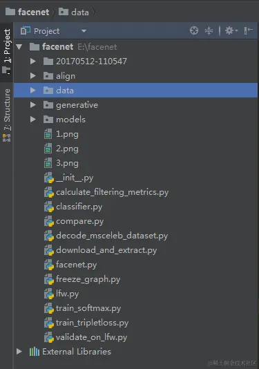 二、精简代码。作者在代码里实现了很多功能,但是对于初学者来说,很多代码是没有必要的,反倒找不到学习这个程序的入口。建议先精简一下代码,便于读懂代码:新建一个文件夹,取名:facenet,把源码中的src文件夹直接拷贝过来。