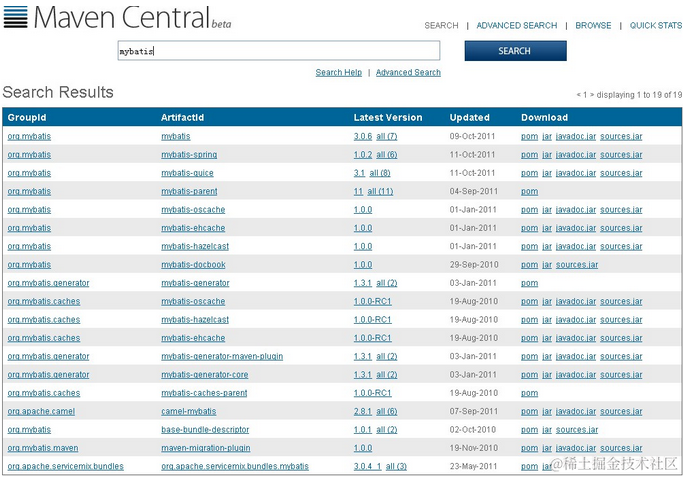 那怎么知道groupId是org.mybatis,artifactId是mybatis呢。方法很简单,可以到maven的官网查询,打开如下网址,查询框中输入mybatis