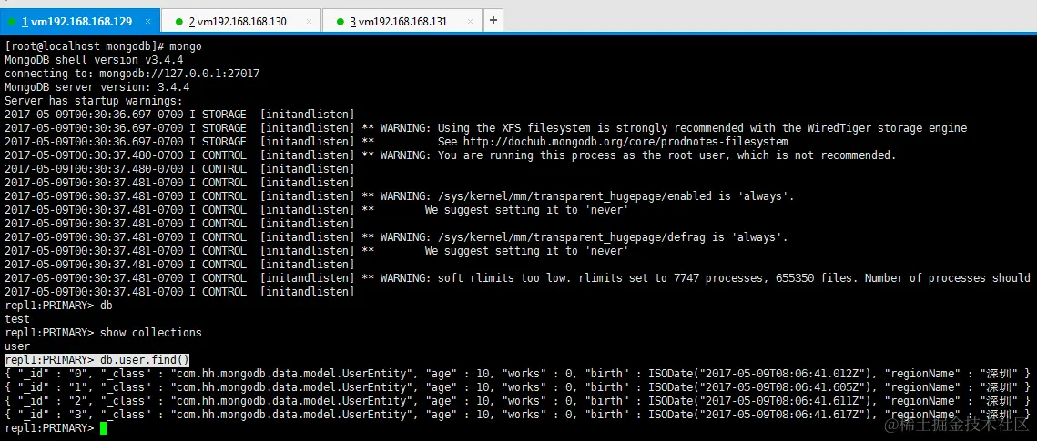 控制台显示成功连接复制集,192.168.168.129:27017为Primary,192.168.168.130:27017和192.168.168.131:27017为Secondary:
