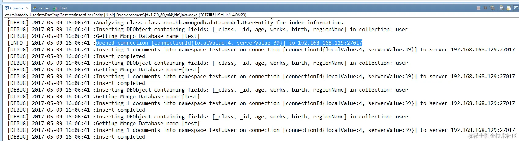 再次执行插入数据的测试用例,这时候就可以看到执行插入操作时,连接的是新的主复制集192.168.168.130