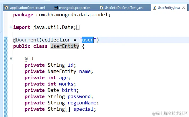 实体类,通过注解 @Document(collection = "user")指定collection名称: