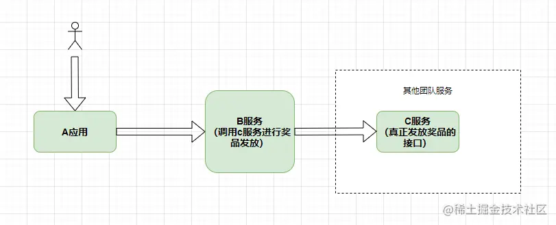 现在 有一个场景,领取礼品,每个用户有次数限制,用户通过前端点击,调用了应用A的接口,里面调用了服务B,服务B里面去调用了服务C,注意服务C是其他部门的服务。服务C负责真正的发放礼品。(假设这个服务C我们是不可修改的,A,B是自己团队负责的,并且可能出现高并发的情况)