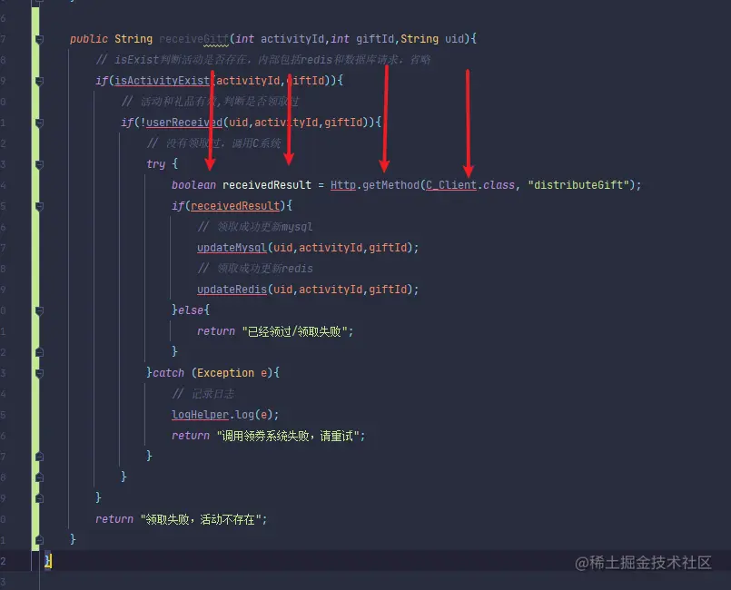 首先流程上与上面的查询是否领取过有些类似,,但是在查询是否领取过这一步之后,有所不同。如果已经领取过,则直接返回,但是如果没有领取过,需要调用C服务进行领取,如果调用C接口失败,或者返回领取失败,B服务需要做的事,就是记录日志或者告警,同时返回失败。
