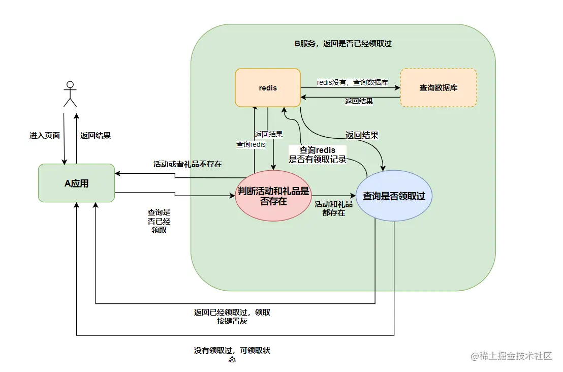 查询是否领取的流程大致如下: 用户进入页面,前端如果有缓存的话,可以为他展示之前缓存的结果,假设没有缓存,就会请求A应用,A应用会去请求B服务,B服务首先需要判断礼品或者活动是否存在。