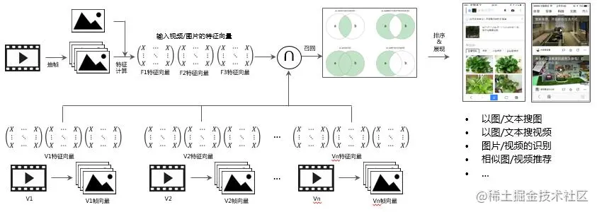首先会在离线对图片、视频等富媒体数据进行加工和处理,识别出其中的内容与语义,然后转变成系统能够识别和处理的属性(如文本标签,分类标签等),质量信息(如站点或者作者权威性,点赞量/播放量等,黄反信息等等),或者光学属性(如清晰度)。这些基础特征信息构成了对一个富媒体数据的全部表述。