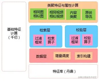 不同富媒体数据之间还会有相同/相似,包含等关系属性。如网上很多的剪辑视频,可能来自某部电影;或者两个一样的视频文件,只是来自不同播放站点带了不同的水印或者封面而已。这种关系,在我们系统中称之为实体粒度的聚合特征(相对于上一段所提到的基础特征)。当两个实体被判断为相同的时候,相关的特征信息可以合并汇聚,供两个实体同时使用。如播放量和点赞量会累加,缺失的特征标签会被另外一个实体补充等等,从而实现内容级别的汇聚。