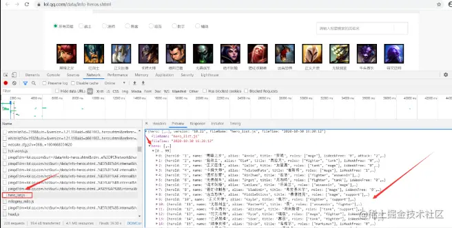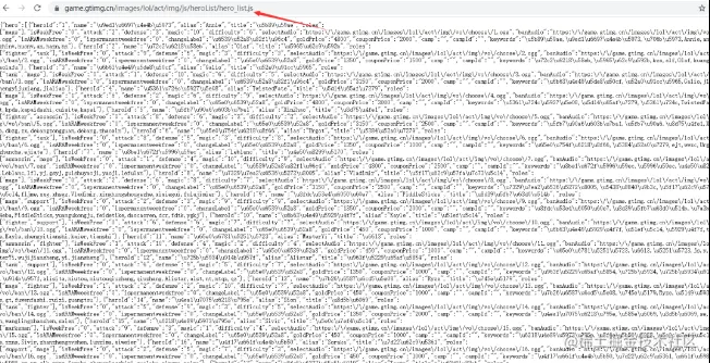 检查可以发现一个一个名为hero_list.js的文件,里面保存了所有英雄的有关信息,可以将里面的内容复制下来保存到本地txt,然后再利用Python转为json。