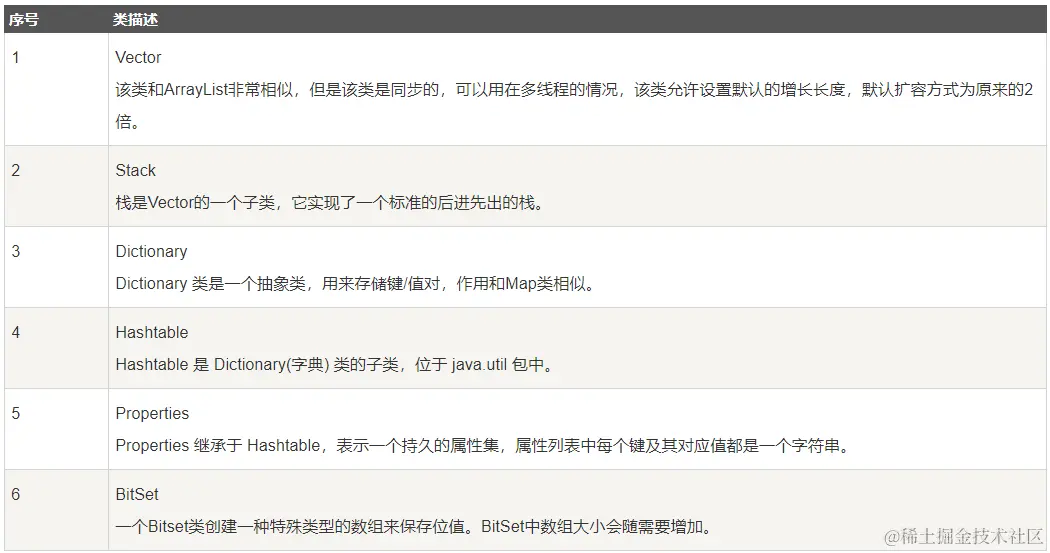 早在 Java 2 中之前,Java 就提供了特设类。比如:Dictionary, Vector, Stack, 和 Properties 这些类用来存储和操作对象组。