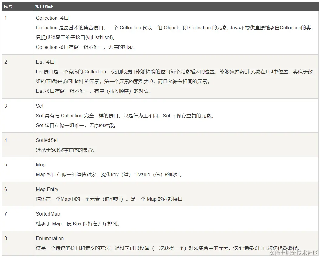 2. 集合是一个对象,可容纳其他对象的引用。集合接口声明对每一种类型的集合可以执行的操作。