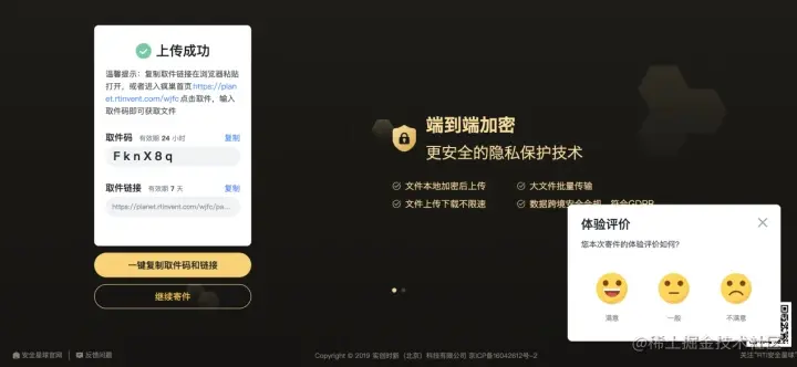 交互方面,操作界面极简,界面中心只留了一个大按钮,添加文件后,文件会被快速上传,随后生成该文件的取件码、取件链接。