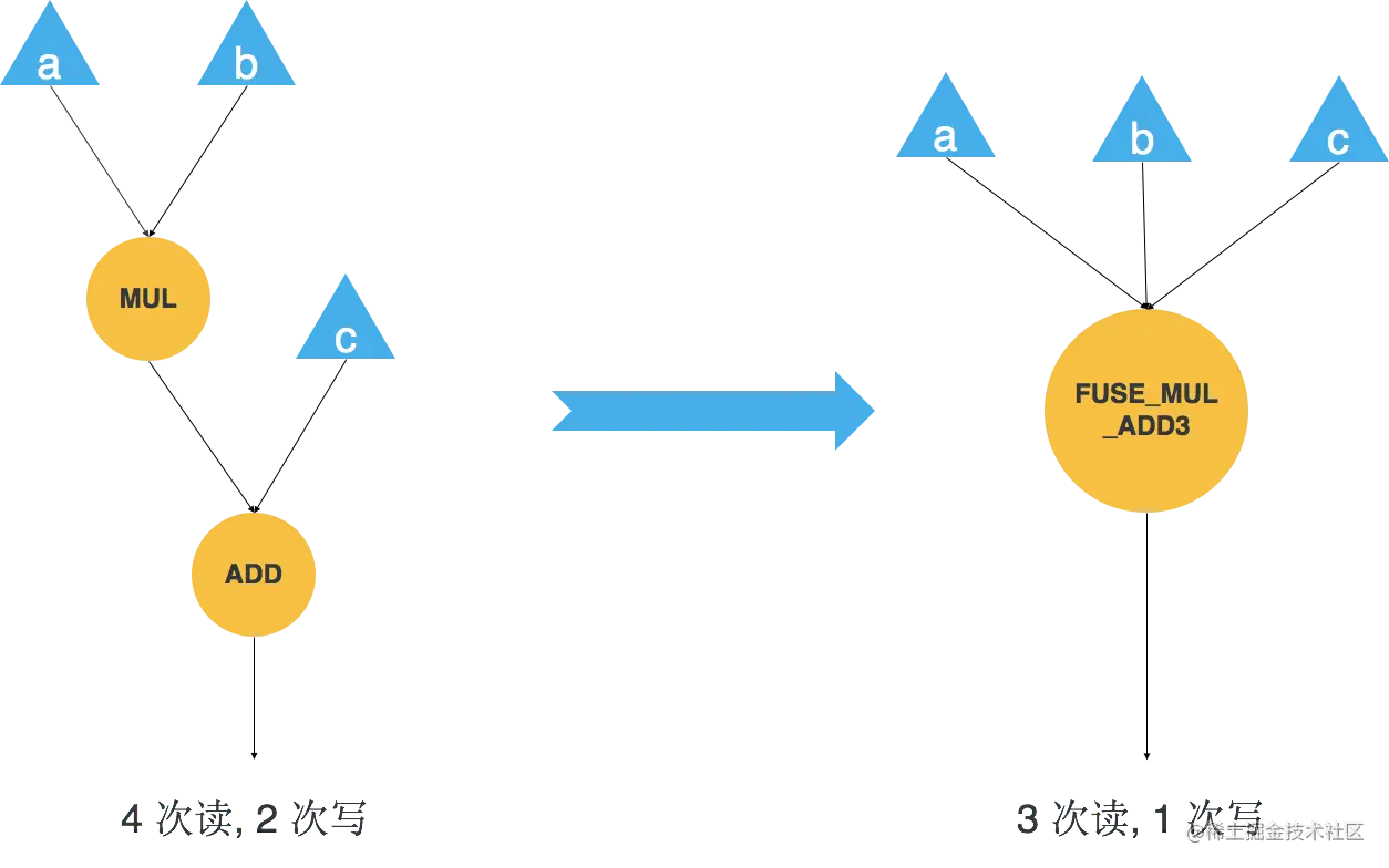 我们通过 Element-wise Fusion 可以把多个 element-wise 操作融合成一个,减少了算子数量也就减少了算子之间的读写次数。如图 3 所示计算图算的是 “a*b+c”,它需要 4 次读,2 次写。4 次读分别是乘法在读 a 和 b 两个输入,乘法其实还要写一个隐藏的输出,加法会读乘法的输出作为输入,以及加法读 c 作为输入。两次写分别是乘法和加法对它们结果的两次写操作,总共加起来是 4 次读,2 次写。