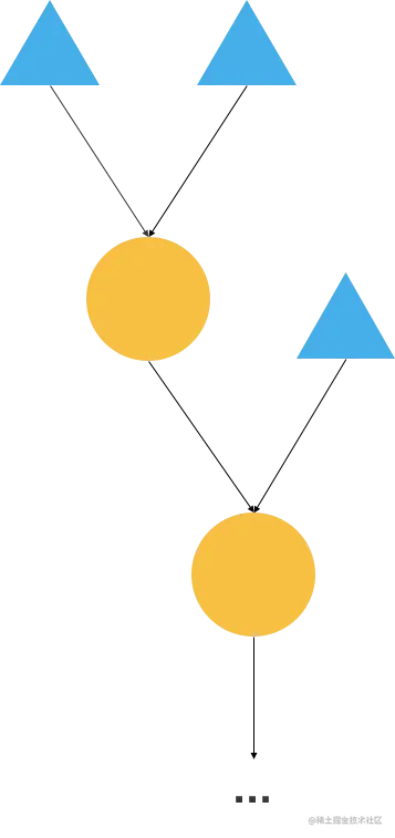 动态图和静态图是相对的,在动态图下是没有计算图的概念的。但在静态图下,天元会维护一张计算图。如图 2 所示为天元中的计算图表示,图中圆形表示算子(operator),三角形表示输入。在天元框架中,动态图和静态图之间的转换只需要一条简单的语句即可完成,如下代码所示: