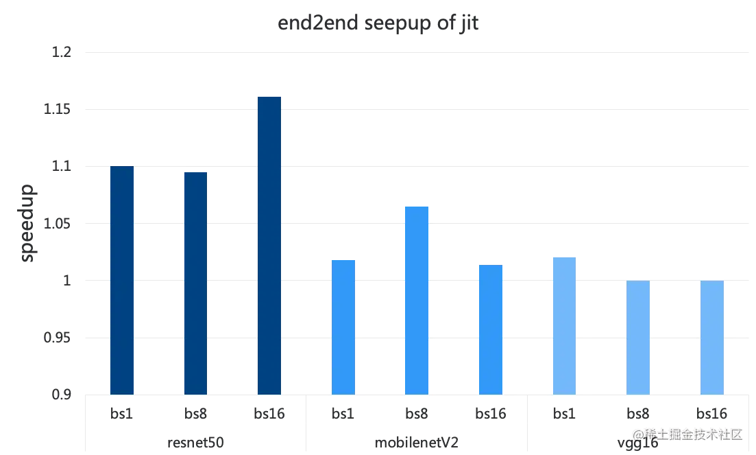 由图 9 可知,和不打开 JIT 支持相比,打开 JIT 支持后 resnet50 最高可以获得 16% 的加速比,mobilenet V2 则能获得 6% 到 7% 的加速比,而 vgg16 其实上没有明显加速效果。这是因为 vgg16 模型很大,可以被优化的 element-wise 操作比较少。JIT 的优化效果跟具体的模型是有紧密关系的。