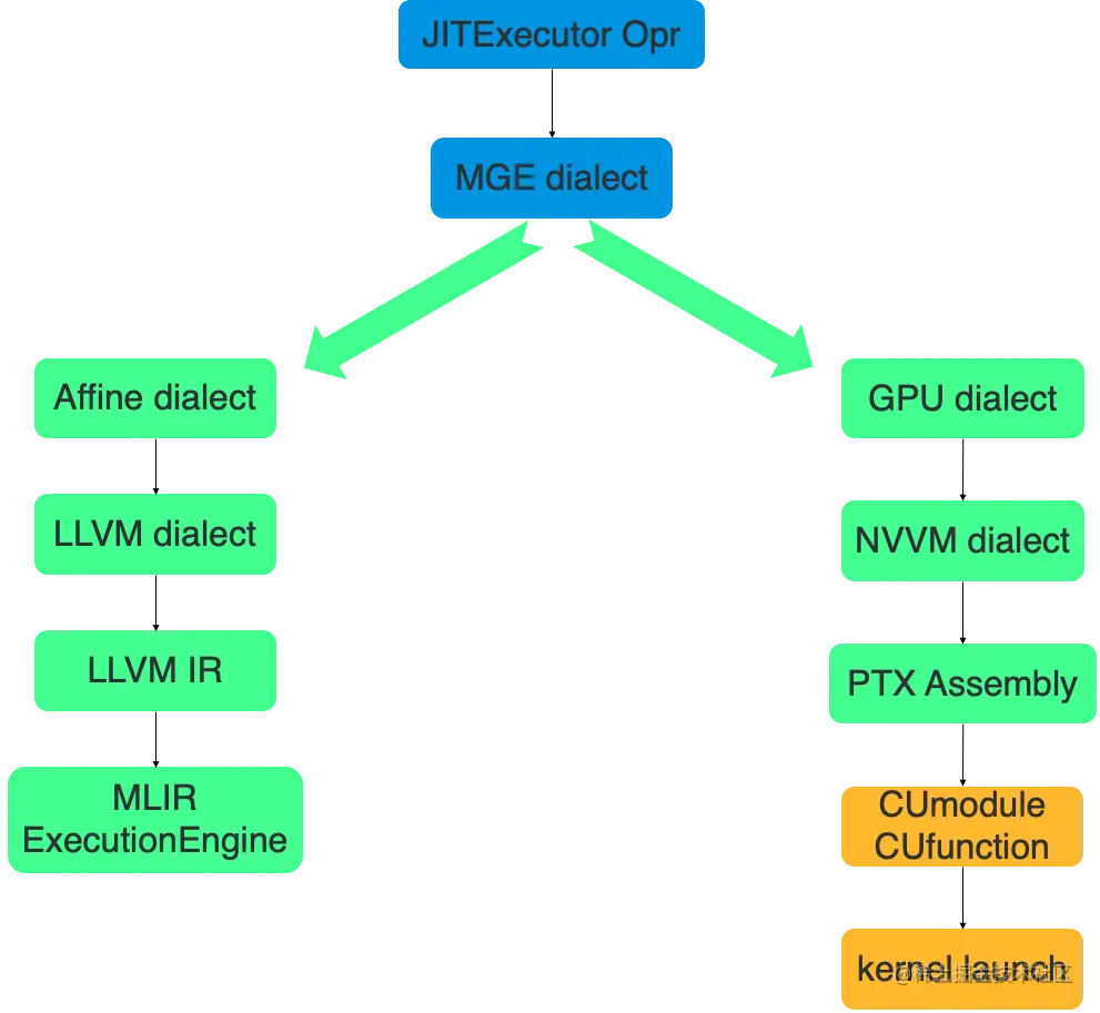 天元首先将 JITExecutor 算子内部的 internal graph 翻译成 MGE Dialect。在 CPU 上,MGE Dialect 会先 Lowering 到 Affine Dialect 上,然后会通过 LLVM 的组件 Lowering 到 LLVM Dialect 上,LLVM Dialect 可以被直接翻译成 LLVM IR。在这一步之后,其他优化工作都可以直接复用 LLVM 的基础组件。最后天元使用 MLIR ExecutionEngine 执行 LLVM IR 生成的代码。在 GPU 上,天元会先将 MGE Dialect Lowering 到 GPU Dialect上,随后 Lowering 到 NVVM Dialect,NVVM 会被翻译成 PTX 汇编。最后通过英伟达提供的 CUmodule 和 CUfunction 两个机制运行。