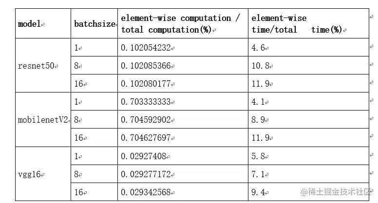 element-wise 操作在卷积神经网络中所占的地位不可忽视。如表 1 所示,我们选择公开的卷积神经网络训练模型,以纯 device kernel 的执行时间为基准统计卷积神经网络中的 element-wise 操作的重要性。