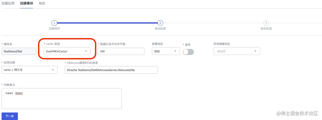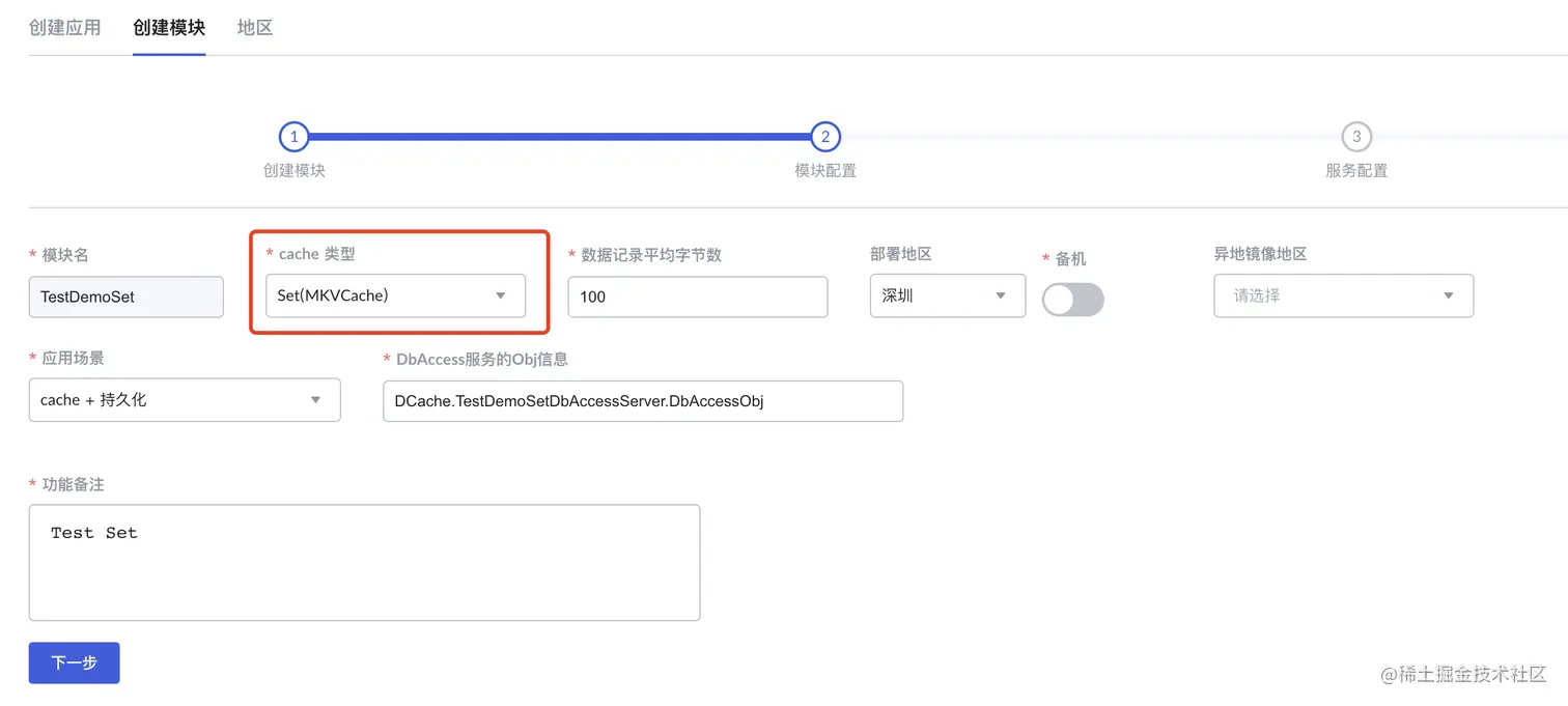 前面的文章我们已经介绍过缓存模块的创建,各类型缓存模块创建流程是相似的。这里 Set 缓存服务命名为 TestDemoSet,cache 类型 选择 Set(MKVCache)