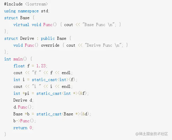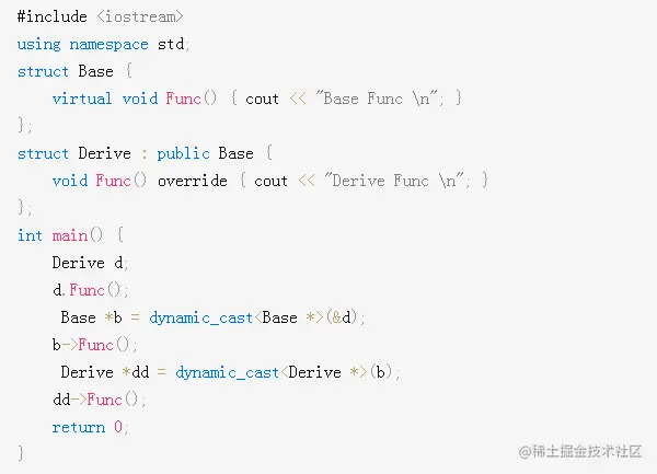 使用场景:用于将父类的指针或引用转换为子类的指针或引用,此场景下父类必须要有虚函数,因为dynamic_cast是运行时检查,检查需要运行时信息RTTI,而RTTI存储在虚函数表中,关于虚函数表具体可以看我的这篇文章:面试系列之C++的对象布局
