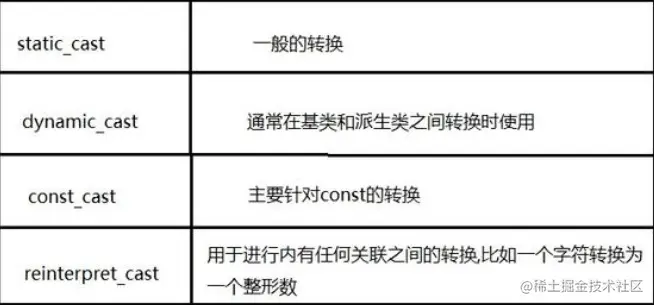 而C++引入的这几种类型转换可以完美的解决上述问题,不同场景下不同需求使用不同的类型转换方式,同时有利于代码审查。
