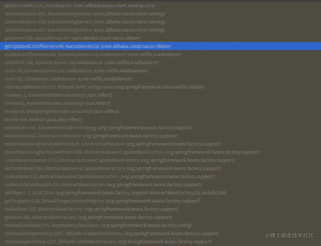 如果项目中用了ribbon+feign框架,那么ribbon获取的server列表又再次进行了缓存。ribbon持有的server列表是由PollingServerListUpdater类的定时调度任务(delay=1s)从nacos更新到loadbalancer里。综上所述,nacos client通过udp实时获取到了server列表,但是ribbon自己又通过调度任务定时更新表列,如此延时越来越长。代码如下。若想ribbon实时接受nacos更新消息,则需修改源码实时监听nacos注册中心,如此则代码入侵,如果简单的的等几秒钟。