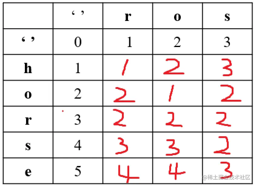 其中,dp[i-1][j-1] 表示替换操作,dp[i-1][j] 表示删除操作,dp[i][j-1] 表示插入操作。
