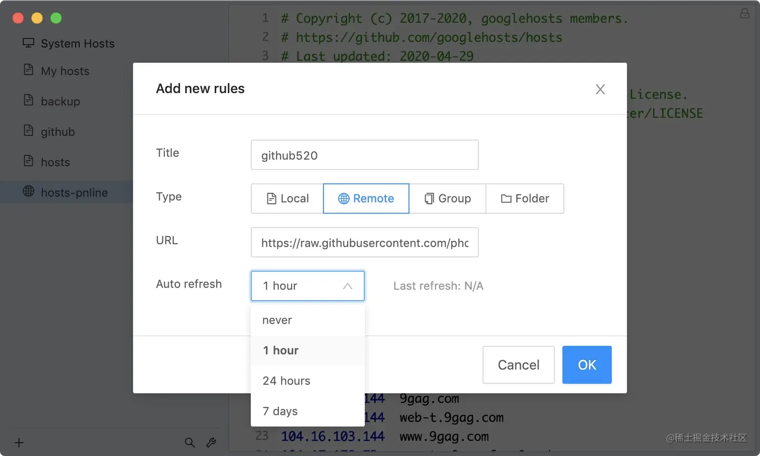 此外,作者为了方便大家更新本地的 hosts,还提供了定时自动更新 hosts 内容的教程,比如使用 SwitchHosts 工具。配置一次,高枕无忧!