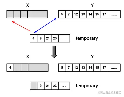 - 将较小的 run 复制到临时 run(假设较小的 run 在栈底)。