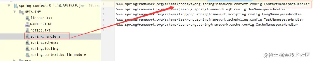 该关系配置在相对于classpath下的/META-INF/spring.handlers中。