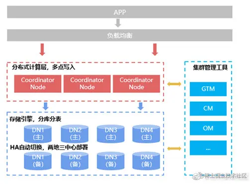 从图中可以看到,主要包括三类节点:协调节点、数据节点、集群类节点(最重要的是全局事务管理器)。协调节点负责SQL解析转发,充当的是类似proxy的角色,数据节点负责计算和数据存储,全局事务管理器负责全局事务读一致性的保证。