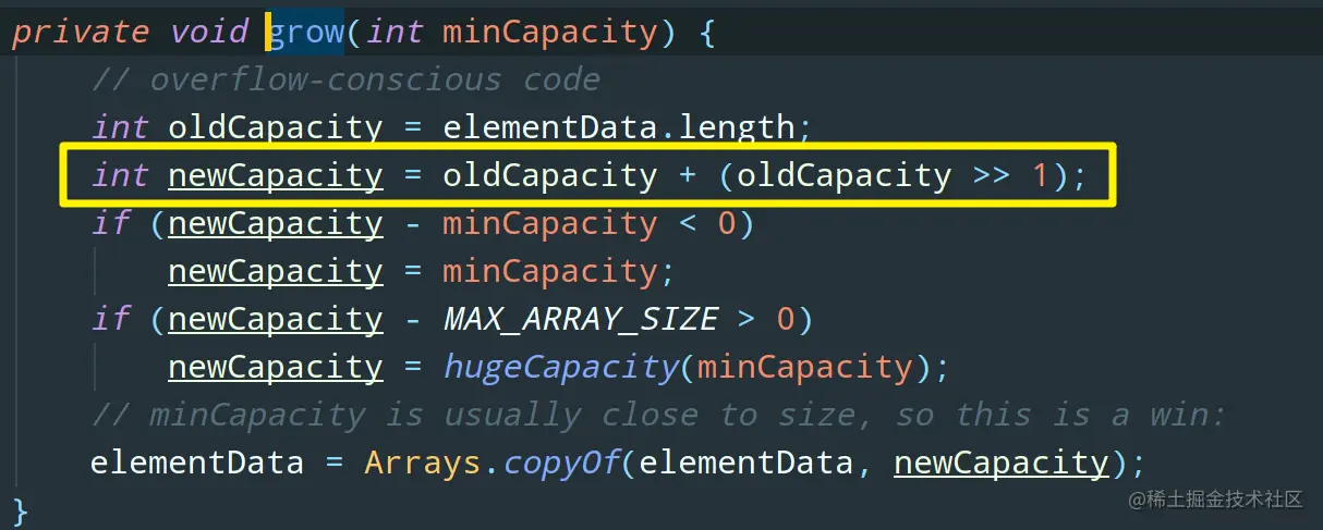 说实话,别的都不用看了,看上面图中的黄色框框就知道 ArrayList 是怎么扩容的了:扩容后的数组长度 = 当前数组长度 + 当前数组长度 / 2。最后使用 Arrays.copyOf 方法直接把原数组中的数组 copy 过来,需要注意的是,Arrays.copyOf 方法会创建一个新数组然后再进行拷贝。