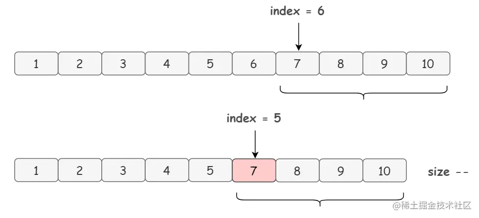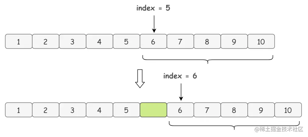 举个例子,假设我们要删除数组的 index = 5 的元素,首先,我们会复制一遍源数组,然后把源数组中从 index + 1 = 6 的位置开始到数组末尾的元素,放到新数组的 index = 5 的位置上: