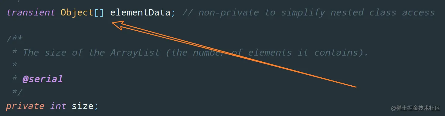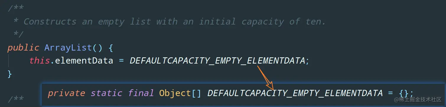 可以看到,它为底层的 Object 数组也就是 elementData 赋值了一个默认的空数组 DEFAULTCAPACITY_EMPTY_ELEMENTDATA。也就是说,使用无参构造函数初始化 ArrayList 后,它当时的数组容量为 0 。