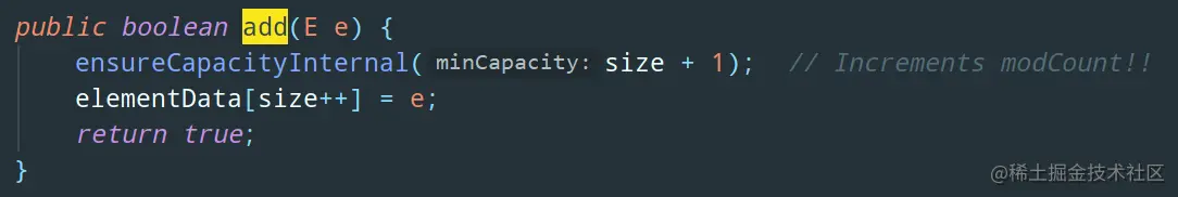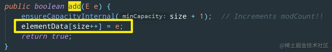 另外,ArrayList 还内置了一个直接在末尾添加元素的 add 方法,不用复制数组,直接 size ++ 就好,这个方法应该是我们最常使用的: