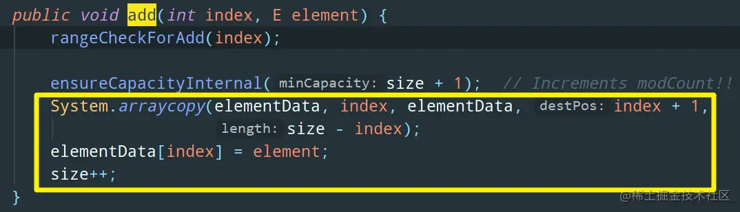 先讲下 add(int index, E element) 这个方法的含义,就是在指定索引 index 处插入元素 element。比如说 ArrayList.add(0, 3),意思就是在头部插入元素 3。