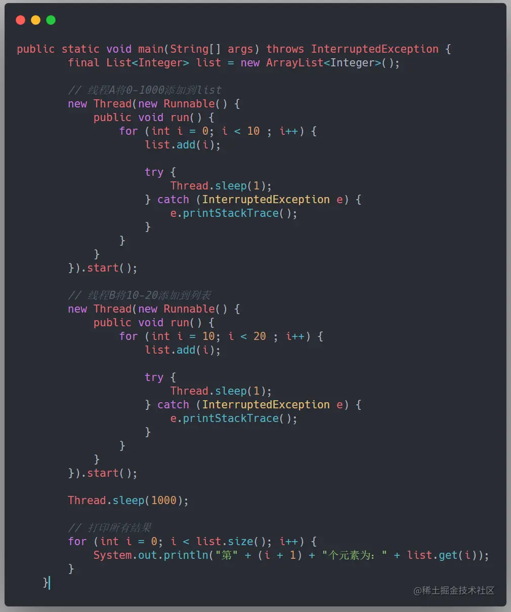 ArrayList 和 LinkedList 都不是线程安全的,我们以在末尾添加元素的 add 方法为例,来看看 ArrayList 线程不安全的表现是啥: