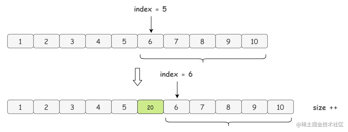 解释一下上面代码中 arraycopy 的意思,举个例子,我们想要在 index = 5 的位置插入元素,首先,我们会复制一遍源数组 elementData(这里我们称复制的数组为新数组吧),然后把源数组中从 index = 5 的位置开始到数组末尾的元素,放到新数组的 index + 1 = 6 的位置上: