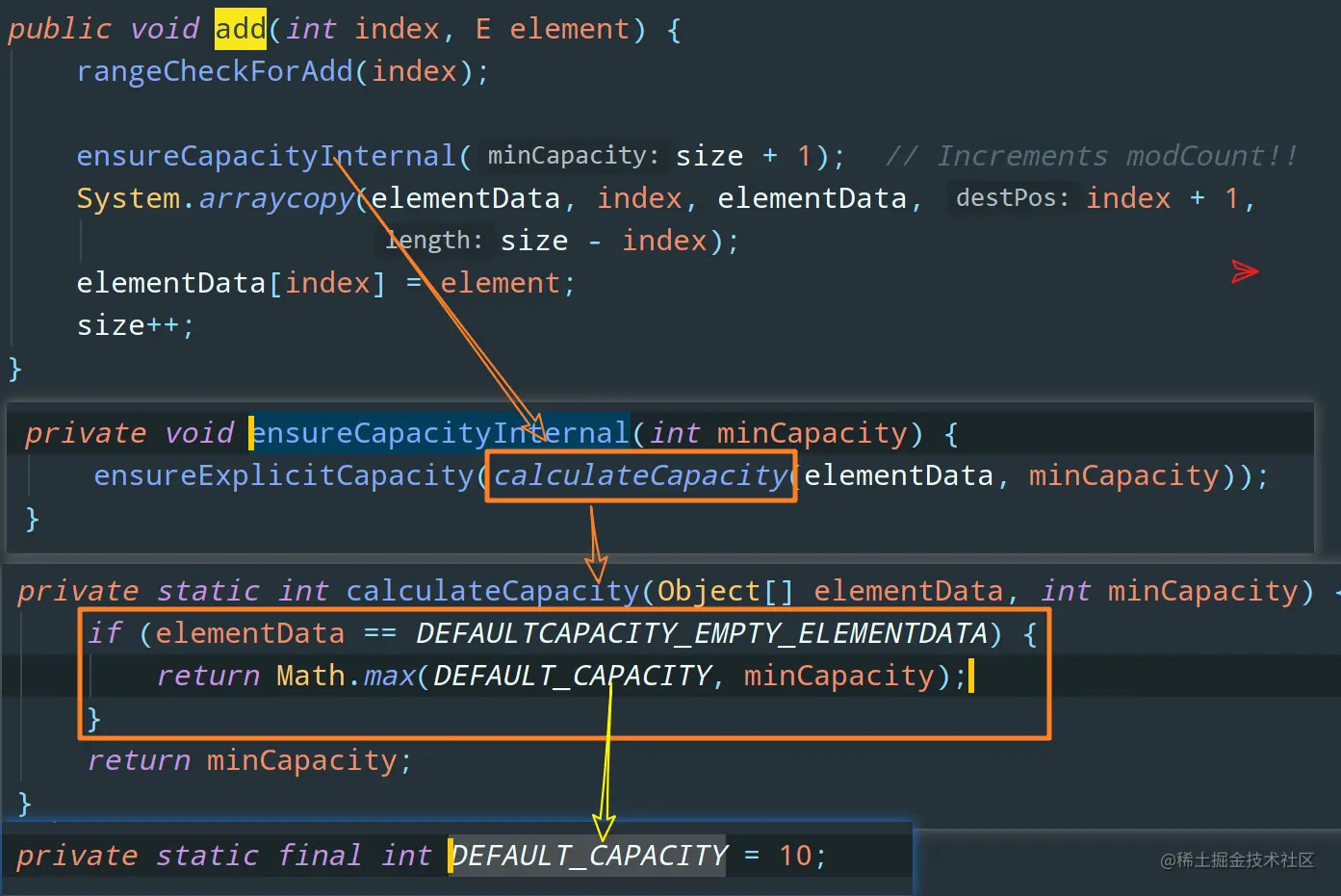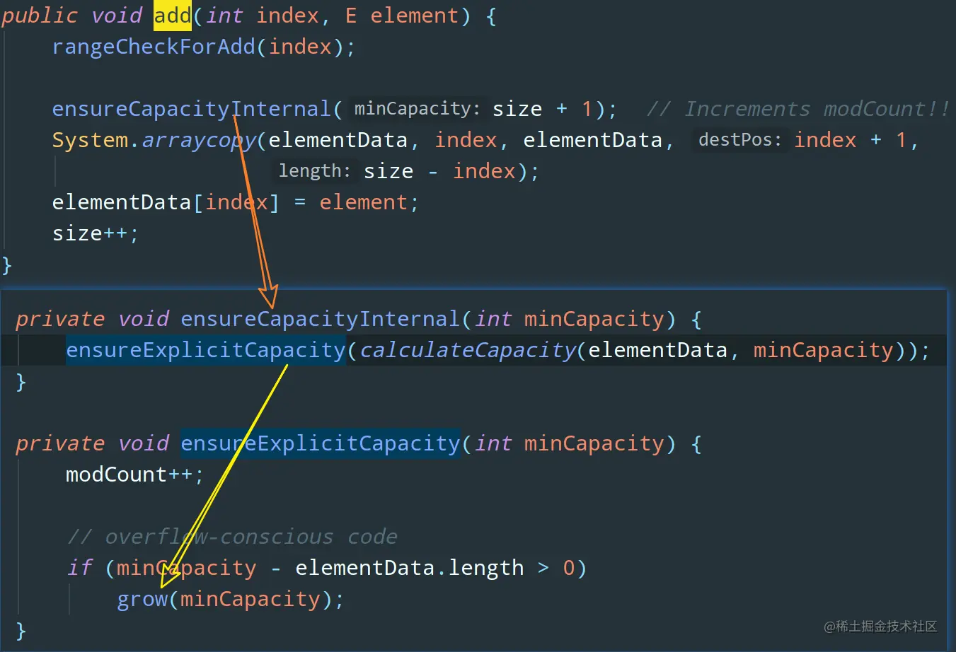 OK,扩容发生在啥时候?那肯定是我们往数组中新加入一个元素但是发现数组满了的时候。没错,我们去 add 方法中看看 ArrayList 是怎么做扩容的: