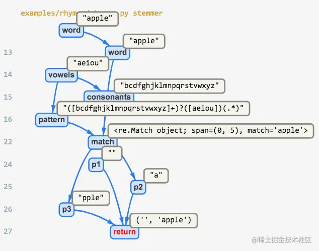 接下来,将鼠标悬停在 “返回 “节点上,所有相关的值都显示出来了,形成了一个从函数开始到结束的跟踪路径: