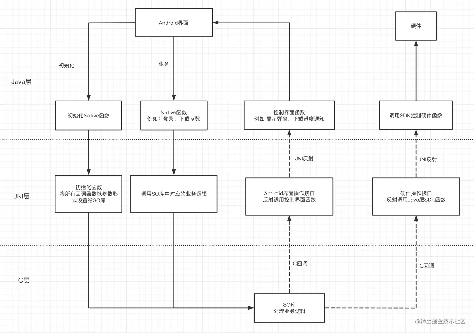 但是由于我们在第三方硬件设备操作,而第三方只提供了Android的SDK,在C层面无法调用,所以硬件操作的接口也需要由我进行封装,提供操作的接口(回调函数,不了解的请看这里)给C开发同事调用。这样就形成了下面的结构: