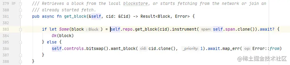 首先在本地的blockstore查找cid对应的block,如果找不到再通过bitswap去查。测试的时候blockstore用的是tokio::Mutex包裹的Hashmap,挂起的问题就出现在从Hashmap中获取block这一步,也就是图中的383行。