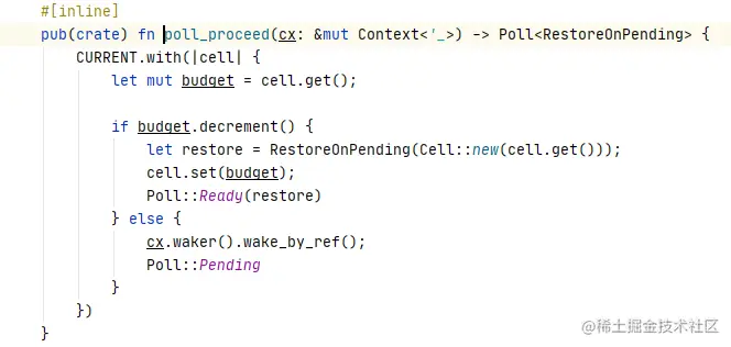 图中所示的coop::budget()会初始化budget变量为128,然后对传入的future进行轮询操作,在这里传入的是Mutex内部的Acquire。Acquire实现了Future,在poll时首先会去检查budget。如果budget足够或者budget不受限制,返回Ready,执行余下的操作,否则返回Pending。