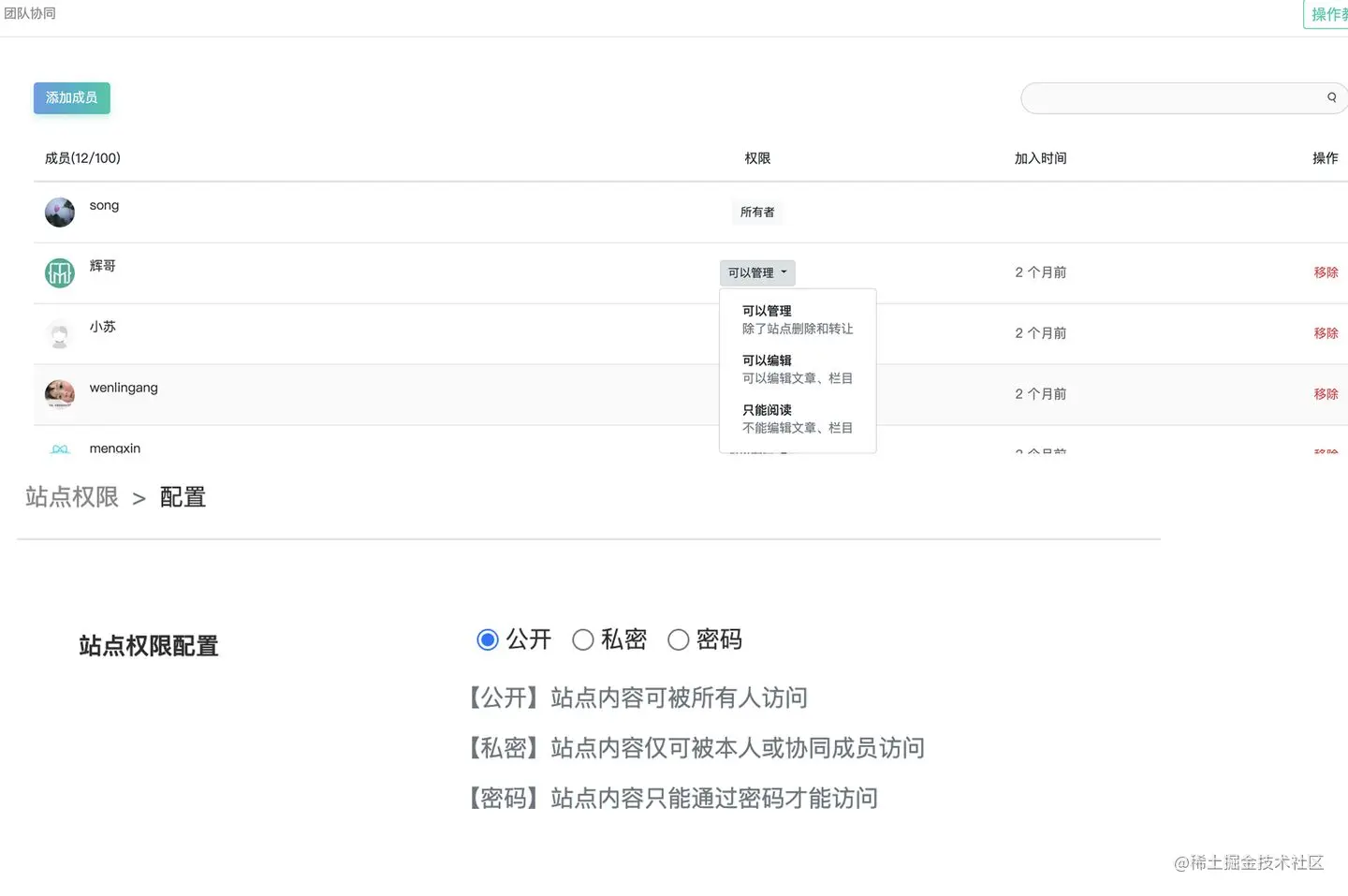- 协同成员的权限管理。