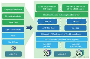 - 定义AArch64和AArch32两套运行环境,分别指向64位和32位指令集,软件可以在需要的时候进行切换。