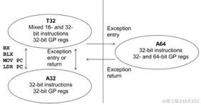 T32,A32和A64指令集与可能导致它们之间切换的事件之间的关系。