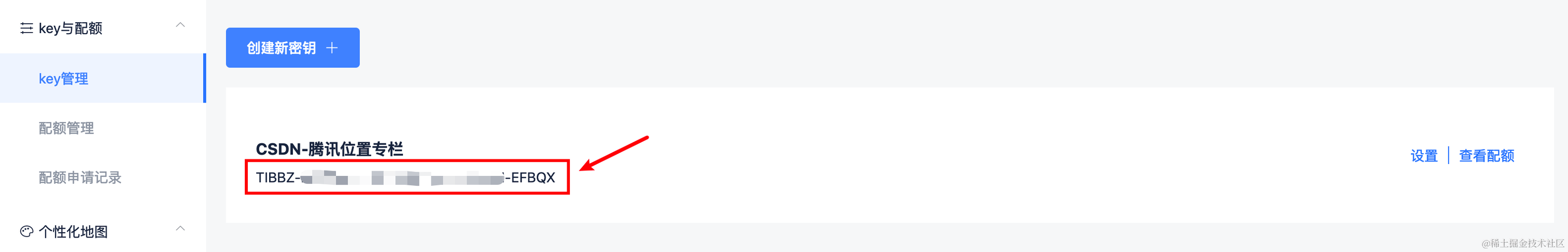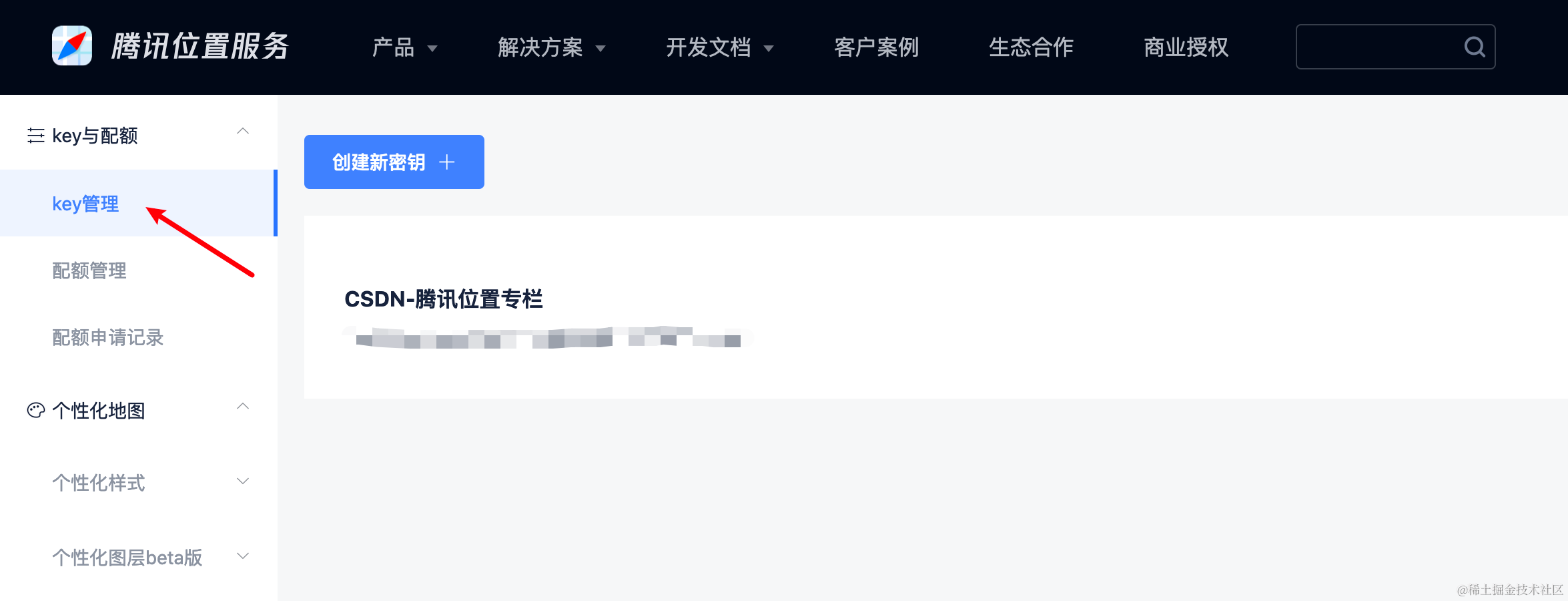 点击左侧key与配额下的key管理: