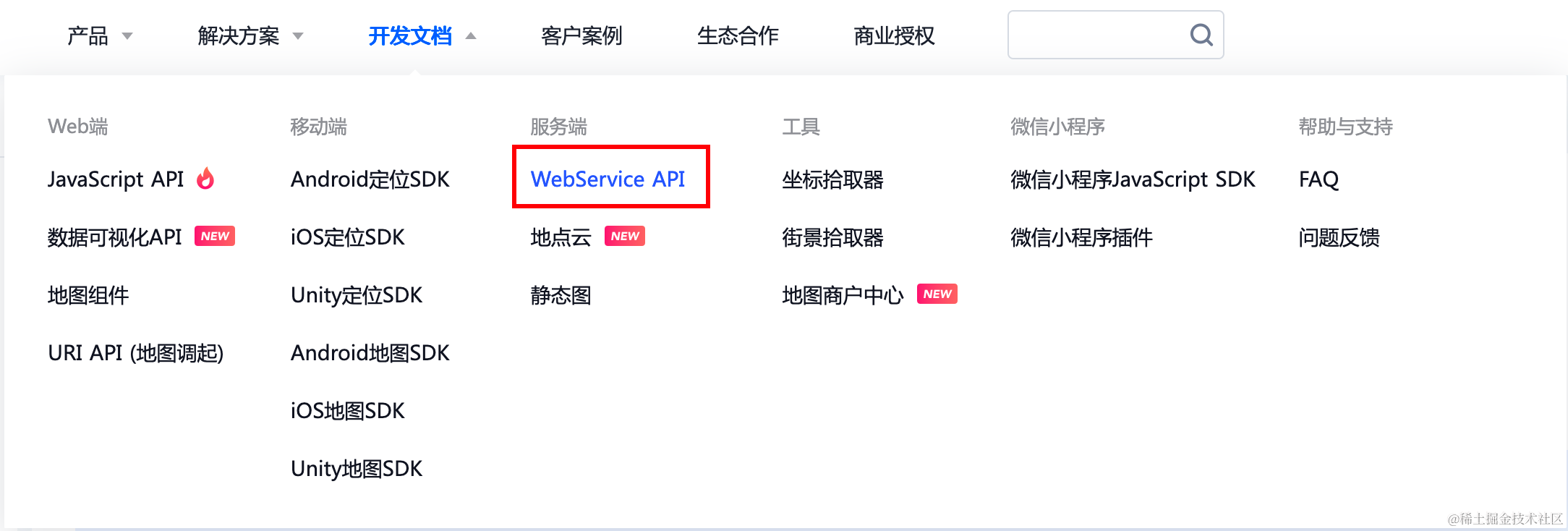 滑动到上方菜单的开发文档 -> 选择服务端下的WebService API: