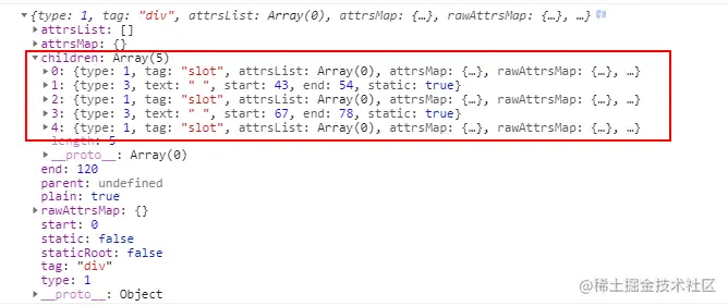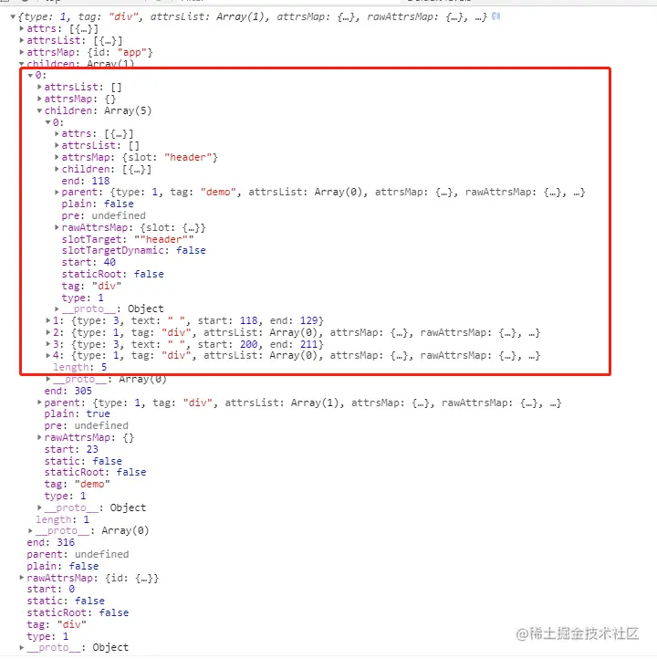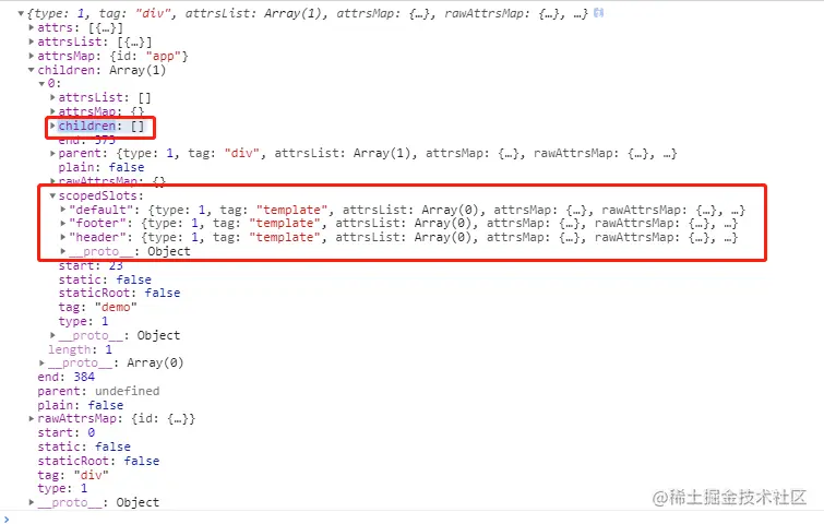 6.最后还会遍历demo ast树的children删除作用域插槽的值,最终children为空数组。