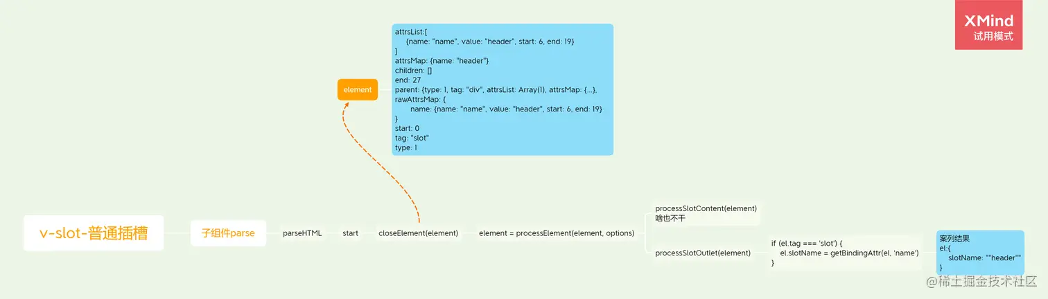 1.在闭合标签后执行closeElement,然后执行processElement执行processSlotContent(element)。